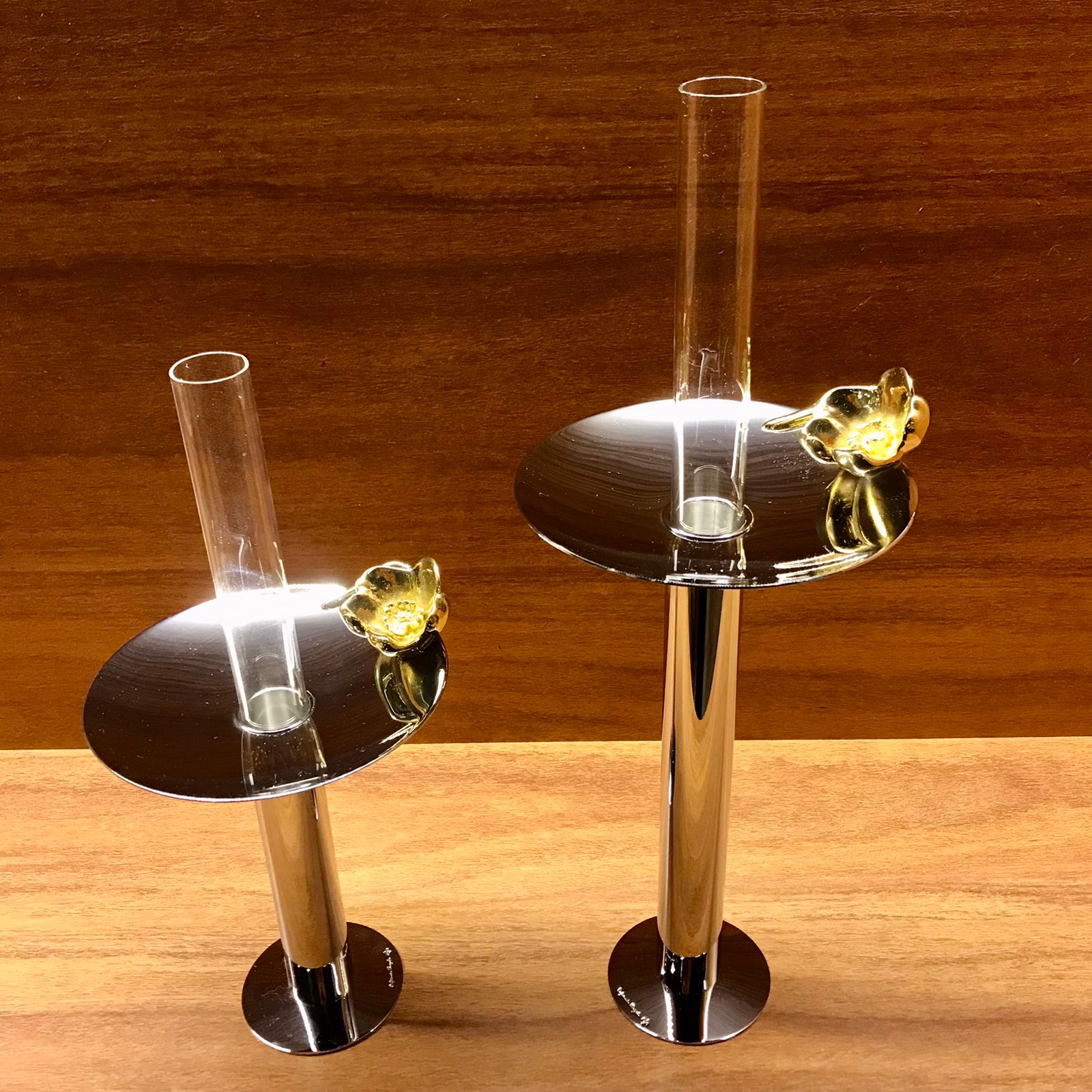 Castiçal inox flor é feito em aço polido e também pode ser usado como vaso solitário. Acompanha tubo de cristal removível. Design minimalista e elegante, ideal para composições sofisticadas.